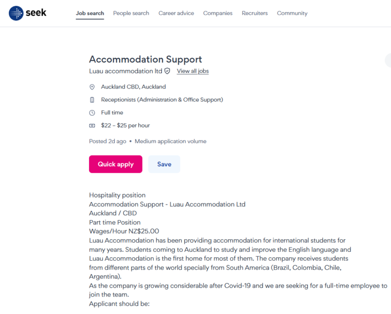 2025年12月現在ニュージーランドの法定最低時給は$23.50なのに対して、サマリーでは、「$22 – $25 per hour」と記されているので、面接や採用時に$23.50以下の時給が提示された場合は違法です。