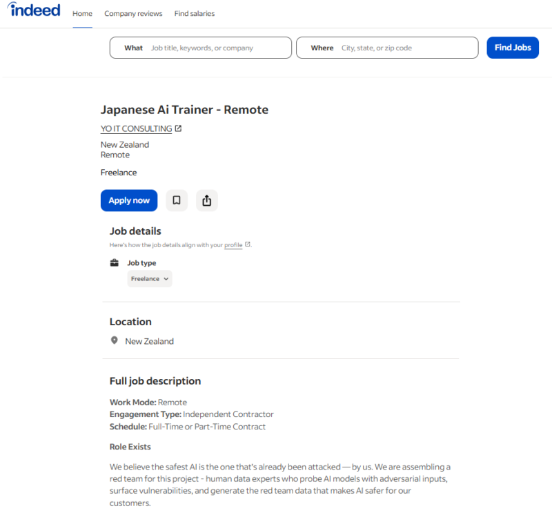 2:求人内容は明確に、AIを攻撃して脆弱性を見つける「攻撃的・防御的な専門職」なので、単に日本語を教えるだけの「AIトレーナー」よりも、踏み込んだ技術的・倫理的なスキルが求められますが、求人タイトルはAIに正しい知識を教えたり、自然な日本語を書かせたりする「学習・教育」のニュアンスが強いものです。
