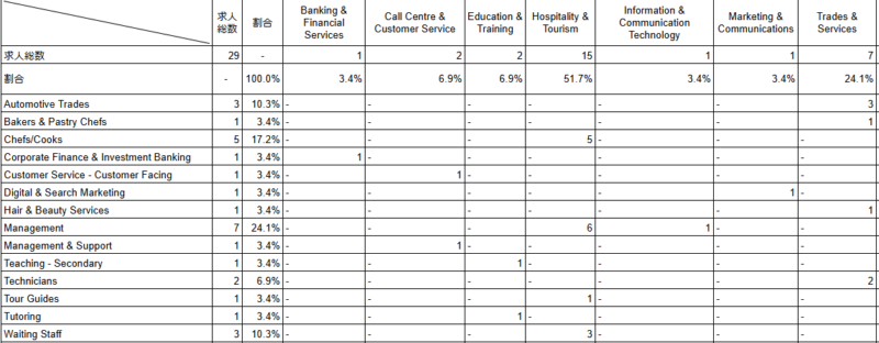 どの業界でどのような職種が募集されているのかを表すクロス集計をみると、常時トップのホスピタリティ業界によるシェフ募集を上回ったのがマネージメント職でした。