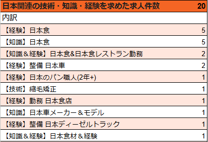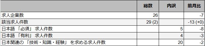 求人の内訳を見ると、日本関連の「技術・知識・経験」を求める求人は前月比-2 と、ほぼ横ばいでしたが、日本語のスキルそのものを求めた求人が、-11と大きく減少していることが分かります。